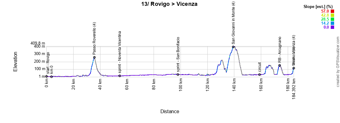 Vanaf de start in Rovigo gaat deze 13e etappe naar het noorden in een vrijwel rechte lijn, en volledig vlak, en na zo'n 30 km komen ze aan aan de voet van een klim, van de Passo Roverello (4e categorie). Na de afdaling hiervan gaan ze verder naar het westen, wederom op het vlakke, en vinden dan twee tussensprints in Noventa Vicentina en San Bonifacio. Op dat moment zijn ze al op een stuk van het parcours wat oostwaarts gaat, en zo'n 20 km verderop wordt het wederom heuvelachtig, om te beginnen met een klein klimmetje en vervolgens de klim naar San Giovanni in Monte (4e categorie), voordat ze zich naar het slotcircuit begeven, wat ze beginnen in Santa Croce Bigolina.Vanaf dat punt klimmen ze allereerst naar de finish bij het Santuario Monte Berico in Vicenza (4e categorie, 750 m à 10%), waarna ze via Sant'Agostino en Arcugnano, waar ze de Red Bull KM vinden bovenop een klimmetje van 2,5 km à 5%, en via Torri, Tormeno en Santa Croce Bigolina, weer terugkomen bij de plek waar ze op het circuit terecht kwamen. Op de terugweg naar de finish in Vicenza beklimmen ze natuurlijk wederom de klim van de 4e categorie.
