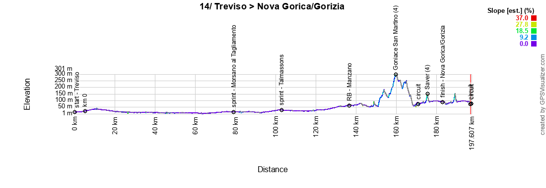 Voor deze eerste dag van het 3e weekend is de 14e etappe van de Giro d'Italia 2025 over het algemeen vlak, maar in het laatste stuk van de etappe, zorgen twee klimmetjes voor 3 obstakels op de weg van de renners.Vanuit Treviso gaat de etappe naar het westen richting de grens met Slovenië. Voordat ze aan de grens aan komen vinden de renners tussensprints in Morsano al Tagliamento en Talmassons, en de Red Bull KM in Manzano. De koers gaat vervolgens de grens met Slovenië over, waarna de renners eerst klimmen naar Goniace San Martino (4e categorie). Ze gaan vervolgens weer de grens over om terug in Italië te komen en zich te begeven richting het slotcircuit, wat de Italiaanse en Sloveense kanten van de grensstad van Nova Gorica (Italiaanse kant) / Gorizia (Sloveense kant) bezoekt. Aan de Sloveense kant beklimmen ze een soort van muur in Saver, en aangezien dat gebeurt voordat ze over de finishlijn komen, vinden ze deze klim weer terug bij de tweede doorkomst, voordat ze gaan finishen aan de Italiaanse kant van de stad.
