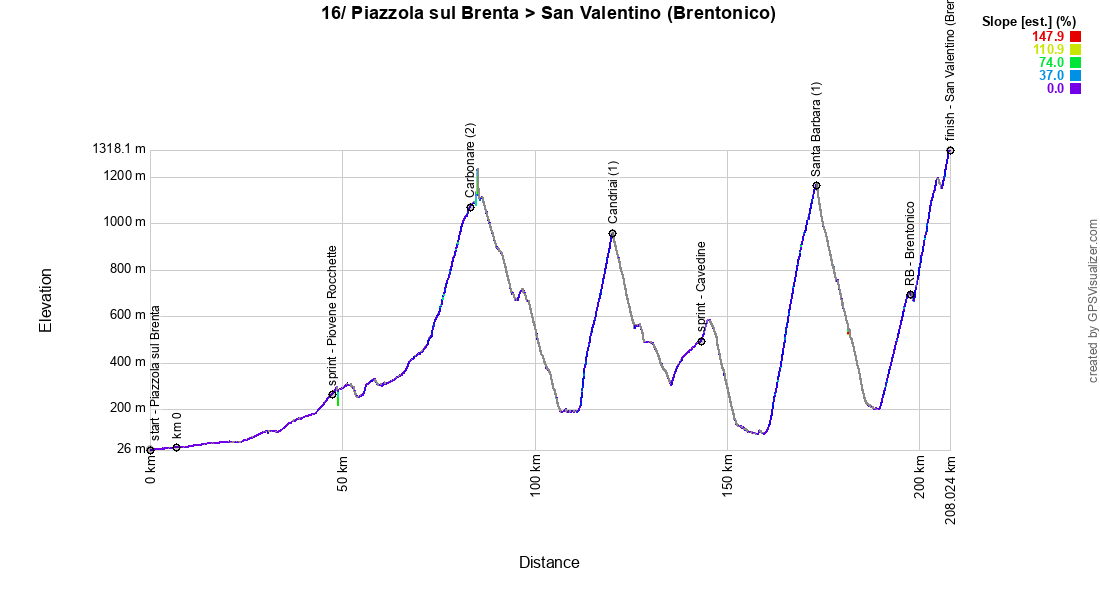 De laatste week van de Giro d'Italia 2025 zal allesbehalve eenvoudig zijn en dat begint al meteen met deze 16e etappe. Na de start in Piazzola sul Brenta, gaat de weg namelijk al bergop terwijl de renners zich begeven richting de tussensprint van Piovene Rocchette. Ze verlaten dan het stedelijk gebied en iets verder beginnen ze dan aan een echte klim, tot aan de eerste bergtop van de dag, de klim naar Carbonare (2e categorie, 12,9 km à 4,6% met een maximum van 10%), en de afdaling hiervan gaat vrijwel meteen over in een klim van de eerste categorie, naar Candriai (10,1 km à 7,6% met een maximum van 13%).Ze zetten dan koers naar het zuiden en in een klimmetje wat volgt betwisten ze de tussensprint van Cavedine voordat ze beginnen met wederom een echte zware klim van de 1ste categorie, die van Santa Barbara (12,7 km à 8,3% en een maximum van 14%). Zodra ze weer aan de voet hiervan aankomen gaan ze meteen verder met de slotklim, die trapsgewijs plaats vindt, met een eerste tree die eindigt in de Red Bull KM in Brentonico, vervolgens een tweede en na een kort stukje bergaf uiteindelijk de laatste tree, die ze brengt naar de finish op de Passo di San Valentino (1ste categorie, 18,2 km à 6,1% en een maximum van 14%).
