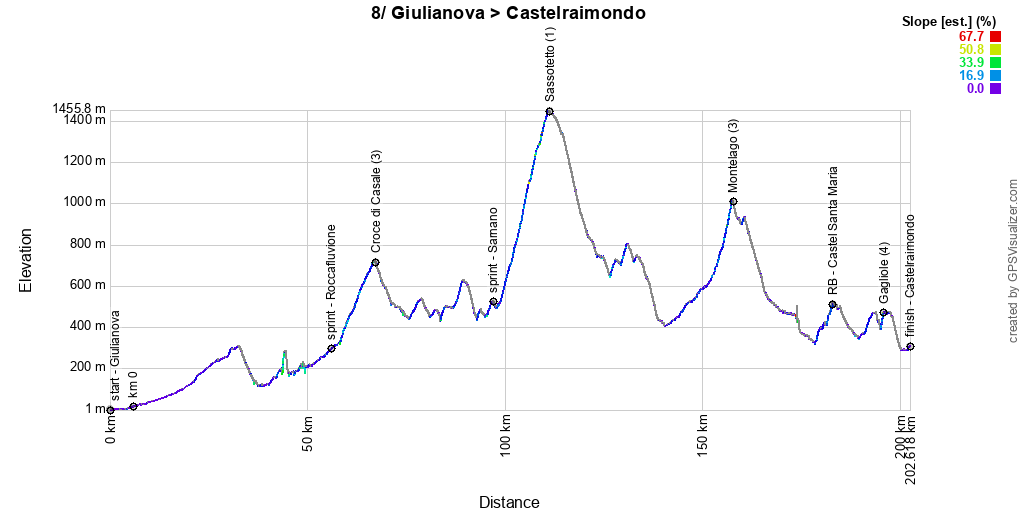 Etappe 8 van de Giro d'Italia 2025 wordt een vrij lange etappe en, beginnend aan de kust bij Giulianova, kan de weg alleen maar bergop en dat is duidelijk het geval in deze etappe, al was het maar vanwege de serieuze moeilijkheidsgraad van de 1ste categorie klim halverwege de etappe.Eerst vinden de renners de tussensprint in Roccafluvione en dan zijn ze bijna aan de voet van de eerste moeilijkheid van de dag, die van Croce di Casale (3de categorie) en dan is het hetzelfde met de tussensprint in Sarnano. Deze keer staan de renners echter aan de voet van een moeilijkheid van de eerste categorie, met een 13,1 kilometer lange klim van 7,4% (met een maximum van 14%) voor de boeg, de Sassotetto klim. Met deze klim zijn hun problemen nog niet voorbij, want ze gaan vrij snel door naar de Montelago klim (3e categorie) en als ze de finishstad naderen vinden ze de Red Bull KM in Castel Santa Maria. Ze bevinden zich dan op 19,6 kilometer van de finish als de etappe naar het noorden afbuigt, een stukje om op zoek naar een laatste moeilijkheid, de klim van de 4e categorie Gagliole. 6,5 kilometer verder komen ze over de finish in Castelraimondo (waarschijnlijk niet allemaal in een groep en dus helemaal niet in een massasprint).