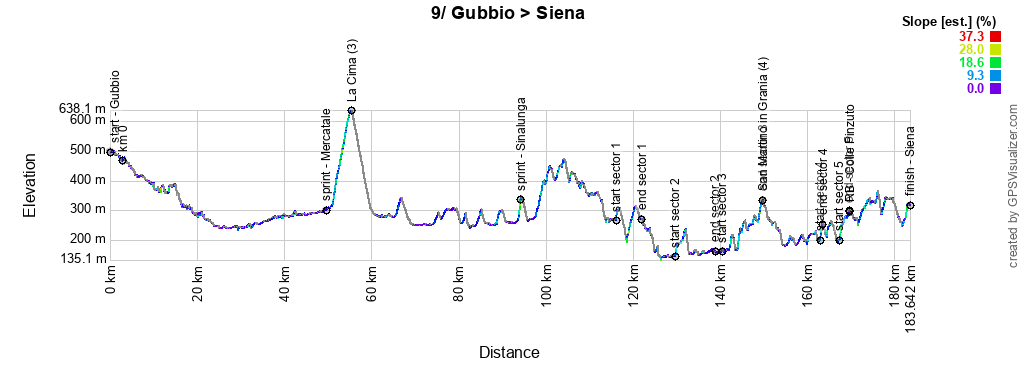 Etappe 9 gaat van start in Gubbio en wordt gemarkeerd door een soort muur die beklommen moet worden na iets minder dan 50 kilometer en door de witte wegen die normaal gesproken te vinden zijn op het parcours van de Strade Bianche. Er wachten de renners 5 witte wegen voor de finish, die ook identiek is aan die van de Strade Bianche. Allereerst betwisten de renners na iets minder dan 50 kilometer de tussensprint bij Mercatale en staan dan aan de voet van de klim van La Cima van de 3de categorie. Ongeveer dertig kilometer na de afdaling van deze klim vinden ze nog een tussensprint, die van Sinalunga, en gaan ze verder richting San Giovanni d'Asso waar ze aankomen in het gebied van de witte wegen. Als ze een deel van de Strade Bianche terugweg volgen, passeren ze maar liefst 5 witte wegen over een afstand van niet minder dan 29,6 kilometer. De 3de daarvan is bergop, richting San Martino in Grania (4e categorie). En net als bij de Strade Bianche is de finish in Siena, op het beroemde Piazza del Campo.Hieronder vindt u het tijd- en routeschema, het profiel en de kaart op OpenStreetMap met het parcours van de 9e etappe van de Giro d'Italia 2025. Klik op de afbeeldingen om ze te vergroten.