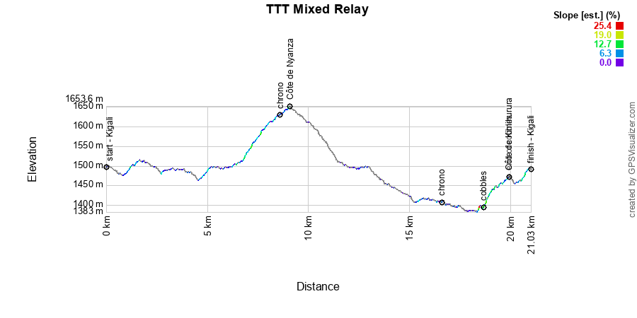 Below you'll find the profile and OpenStreetMap map of the mixed relay time trial course for the 2025 Road World Championships Cycling in Kigali, Rwanda. Click on images to enlarge.