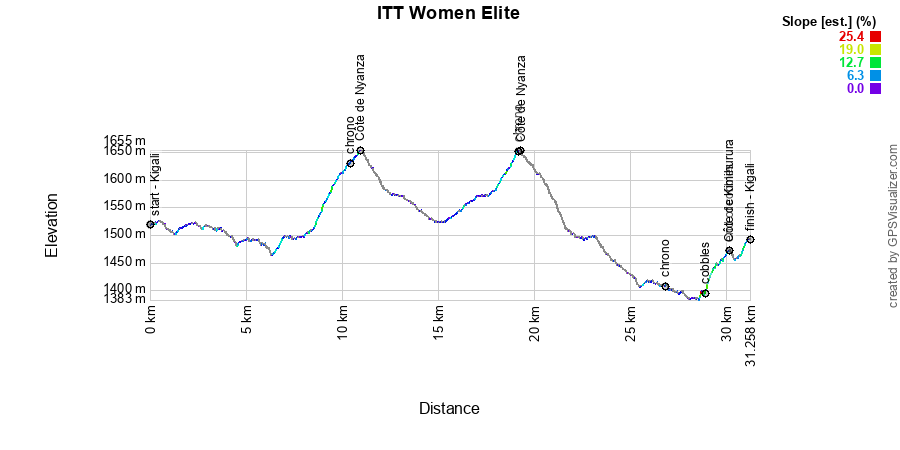 Below you'll find the profile and OpenStreetMap map of the course for the elite women's individual time trial at the 2025 Road World Championships in Kigali, Rwanda. Click on images to enlarge.