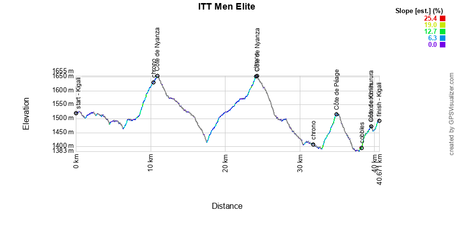 As shown below, the course here is much the same as that for the elite women's individual time trial. For the elite men's race, the U-turn on the NR5 is at Nunga / Murinja. Once back in Kigali, the men's race goes a little further west, as before reaching the cobbled climb, they continue on the NR4 for another climb, the Côte de Péage (2km at 6%). At the top, they turn around at the traffic circle and ride down to the point where the race turns for everyone, to pick up the cobbled Côte de Kimihurura (1.3 km, 6.3%) and reach the finish.Below you'll find the profile and OpenStreetMap of the course for the elite men's individual time trial at the 2025 Road World Championships in Kigali, Rwanda. Click on images to enlarge.