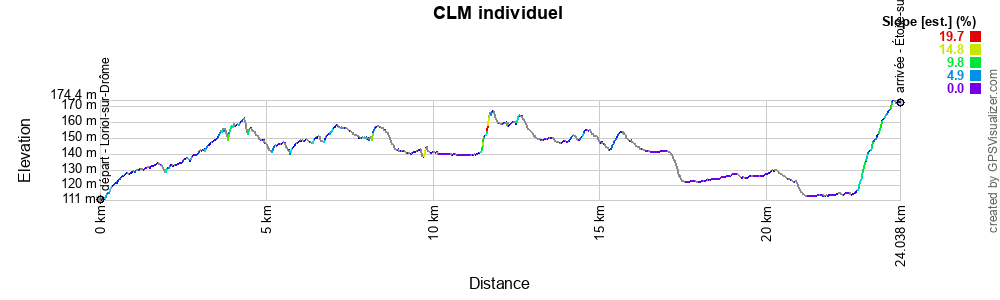After the junior women, the individual time trials continue with the other categories, and the riders taking part in these categories - junior men, U23/espoir women and men and élite women and men - all battle against the clock on the same 24-kilometer course. The course starts in Loriol-sur-Drôme / Livron-sur-Drôme and the riders then head for Allex, where they join the same course as the junior women, bound for Étoile-sur-Rhône. Here, the first part of the course is a little more difficult, with the Mur d'Allex spicing up the first half. Then follows the same flat or downhill section as for the junior women, before finishing with a climb to the finish line over the last kilometer.Here's the schedule for these time trials: