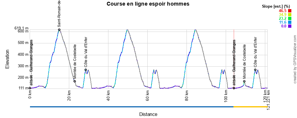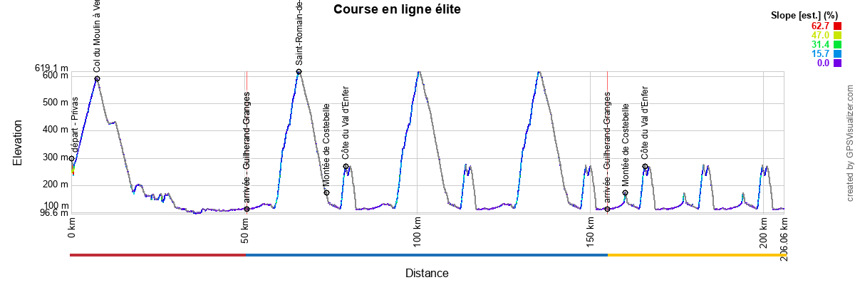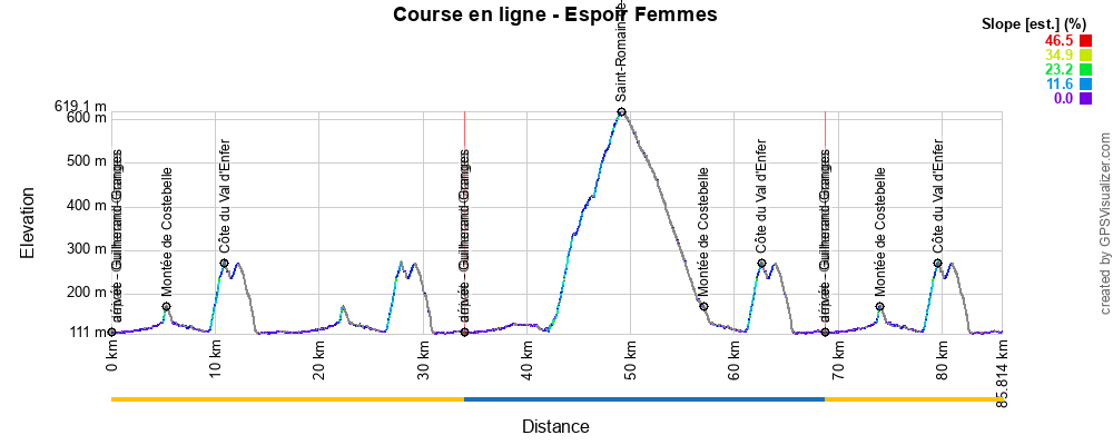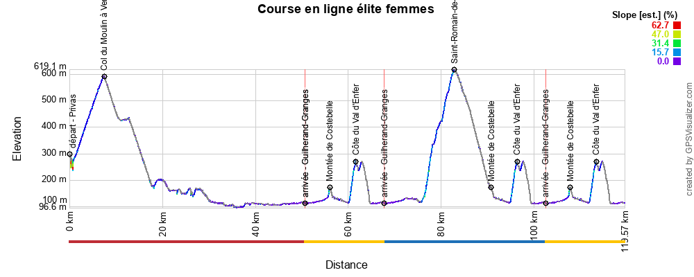 Starting in Privas, the elite women's and men's races begin with an initial course of 47.7 km, and soon after the start offer the ascent of the Col du Moulin à Vent, which takes them all the way to Guilherand-Granges, where they cross the finish line for the first time.For the women, the race then continues first with a lap of the final circuit, then a lap of the hillside circuit, and finally a lap of the final circuit, for a total distance of 116.1 km.