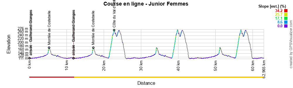 For the junior women's road race, there is firstly a lighter version of the final circuit (shortened, and only with the Côte de Costebelle, thanks to a straightaway at the point where this circuit normally branches off to the right to go for the Val d'Enfer; this part is exceptionally displayed in red on the map and in the profile), followed by three laps of the complete final circuit, for a total distance of 62.9 km.Below you'll find the profile and OpenStreetMap map of the 2025 European Road Cycling Championships junior women's road race. Click on images to enlarge.