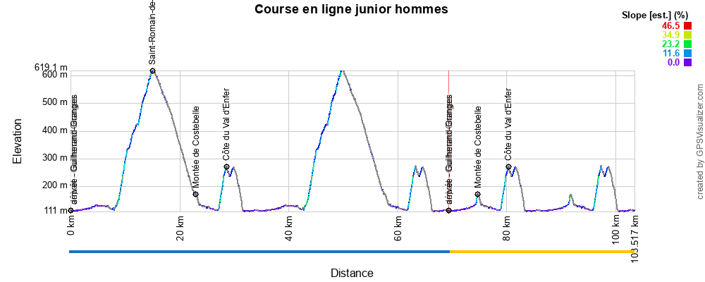 For the junior men's road race, there are two laps of the hillside circuit, followed by two laps of the final circuit, for a total distance of 103.4 km.Below you'll find the profile and OpenStreetMap map of the 2025 European Road Cycling Championships junior men's road race course. Click on images to enlarge.