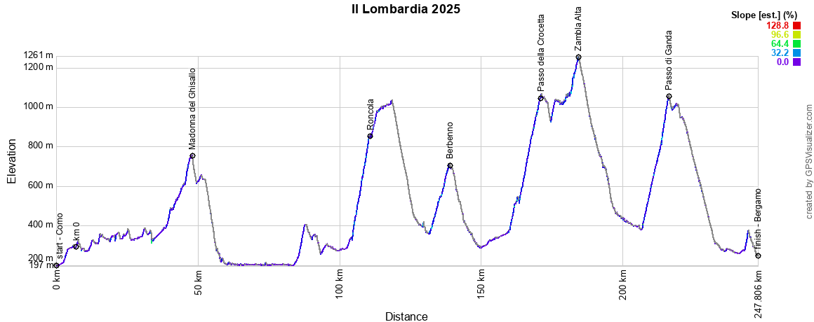 At 10:40 am on Saturday, the race starts from Como on the southern side of Lake Como, heading first for Cantù, then up to Bellagio at the fork of the inverted Y formed by Lake Como. By then, the riders will already have climbed the first of the day's 6 difficulties, the Madonna del Ghisallo (^ 755 m), before following the other branch of the Y to Lecco and beyond to Ciasano Bergamasco.They then traverse eastwards before going up again, via the Roncola ascent (^ 855 m, 9.4 km at 6.6%, but up to 17% at the start of the climb!). The difficulties then follow one after the other, with the climb to BerbennoPasso della Crocetta (^ 1051 m, 11 km at 6.2%, with a maximum of 11%) and the climb to Zambla Alta (^ 1257 m, 9.5 km at 3.5%, with a maximum of 10%). Shortly after the latter, they enter the final branch of the course, heading for the finish, where they will find the climb to the Passo di Ganda (^ 1058 m, 9.2 km at 7.3%, with a maximum of 15% at the end of the climb). The Passo di Ganda has a descent of 19 hairpin bends after Selvino, and at the bottom of the descent there are 9 km on the flat... before the last 5 km start again with a small climb, bearing in mind that the last 3 km to the finish in Bergamo are downhill to via Roma, where the winner of this 119th edition of the Giro di Lombardia will be known.