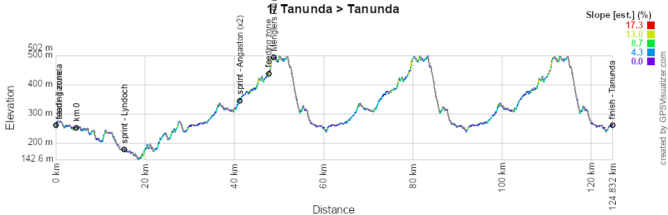 This first stage of the 2026 Santos Tour Down Under will take place on a loop around the town of Tanunda. First (black arrows around the route), the race heads south towards Lyndoch, where an intermediate sprint will take place, before returning to Tanunda and continuing (red arrow), this time towards the northeast.Another intermediate sprint will be contested in Angaston, and the riders will return to Tanunda via the Menglers Hill climb (3rd category). They will then continue in the same way (green arrows) to complete the loop via Angaston and Menglers Hill twice more, before competing for the stage victory in Tanunda.