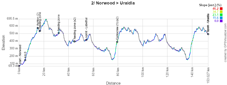 From the Adelaide suburb of Norwood, the riders head east and then south to Stirling (following the black arrows). They then cross the finish line in Uraidla, turning east and heading for the sprint inLobethal. At Cudlee Creek, they reach the northernmost point of this stage before heading towards the Corkscrew climb (1st category, 3.67 km at 9.7% (with a maximum of 16.2%)).They then return to the initial circuit at Ashton, where they encounter a 10 km climb at 4% (with a maximum of 12.6%), and follow the red arrows to cut directly towards the finish line at Uraidla. They then complete this circuit a second time, passing through Lobethal, Cudlee Creek, Corkscrew, and Ashton, before heading back to Uraidla where they will battle it out for victory in this second stage.