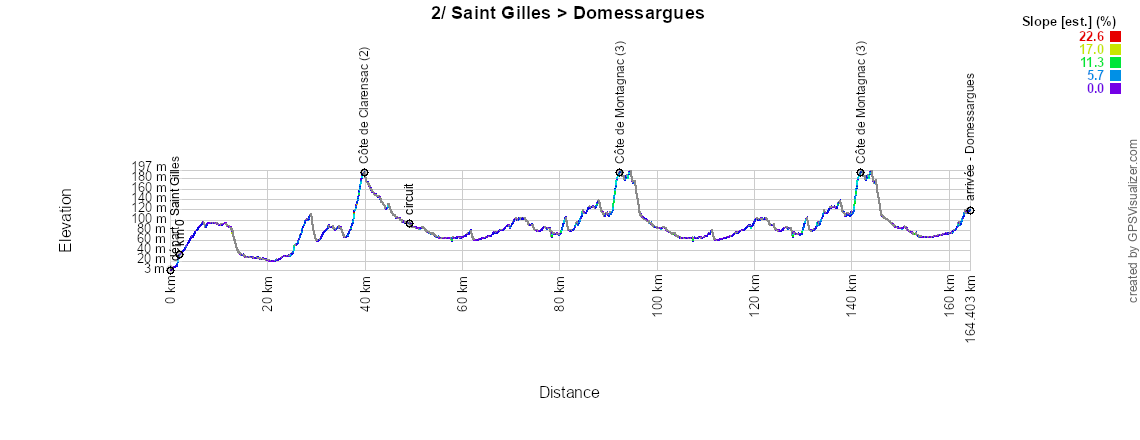 Continuing on, they climb through Mauressargues and Montagnac, then ascend the Côte de Montagnac (3rd category) before descending back to the starting point of the circuit. They then repeat the same circuit before opting for a shorter version of the final loop, which climbs from La Calmette directly north to Nozières, before heading back to Domessargues where the victory of this second stage will be decided.