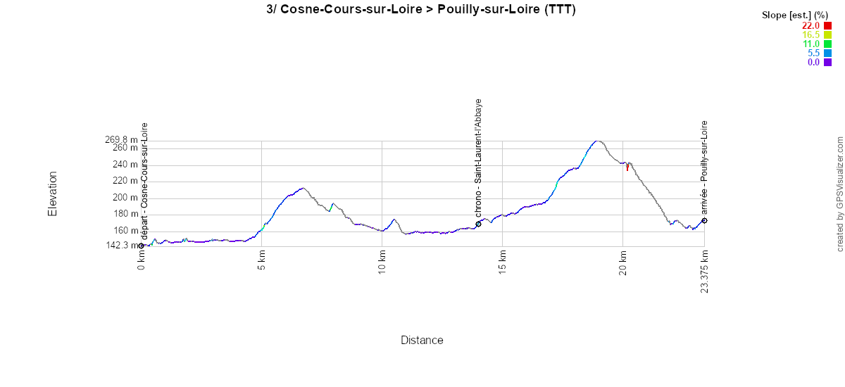 The third stage will be a team time trial: a 23.5-kilometer time trial awaits each of the participating teams between Cosne-Cours-sur-Loire and Pouilly-sur-Loire. An intermediate timing point is planned in Saint-Laurent-l'Abbaye.Below you will find the route schedule, profile, and OpenStreetMap map for this third stage of Paris-Nice 2026. Click on the images to enlarge them.