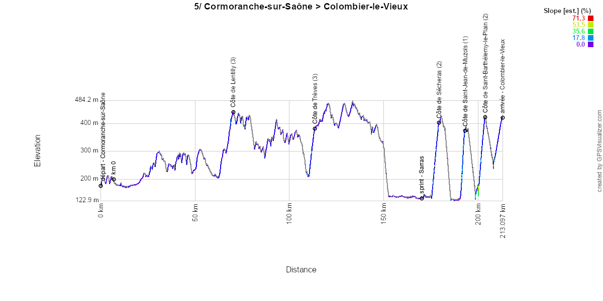 Moving away from the Rhône for the first time, they will then encounter the Côte de Sécheras (2nd category), before returning to it. Moving away from it again, they will have to climb the Côte de Saint-Jean-de-Muzols, a 1st category climb. They then follow the Doux river and have to climb the Côte de Saint-Barthélemy-le-Plain (2nd category), before heading towards the finish in Colombier-le-Vieux, also uphill, but unclassified.