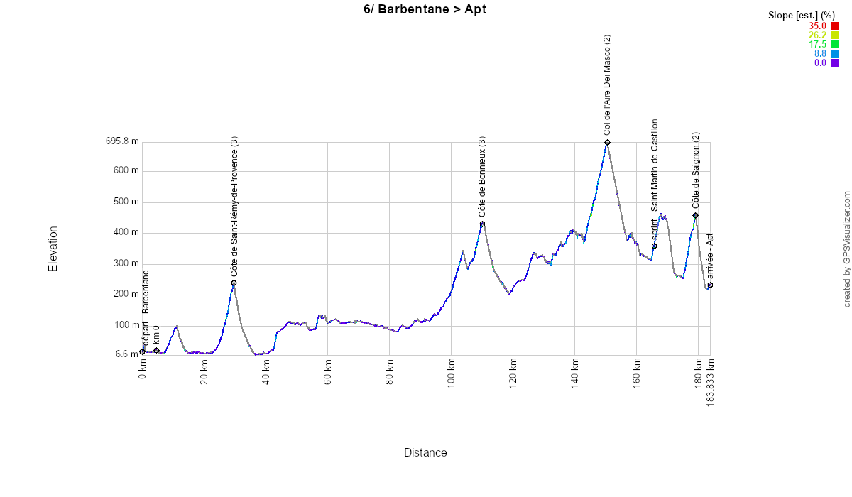 After a long journey, the riders will set off from Barbentane in the Bouches-du-Rhône department. They will soon reach the Côte de Saint-Rémy-de-Provence (3rd category), before passing through Eyguières and Taillades and climbing the Côte de Bonnieux (3rd category).Passing through Lourmarin, La Motte d'Aigues, and Vitrolles-en-Luberon, the riders will arrive at the Col de l'Aire Deï Masco (2nd category). After passing through Céreste, they will then battle it out in the sprint at Saint-Martin-de-Castillon. As they approach the finish, they will still have the Côte de Saignon (2nd category) to climb before crossing the line in Apt.