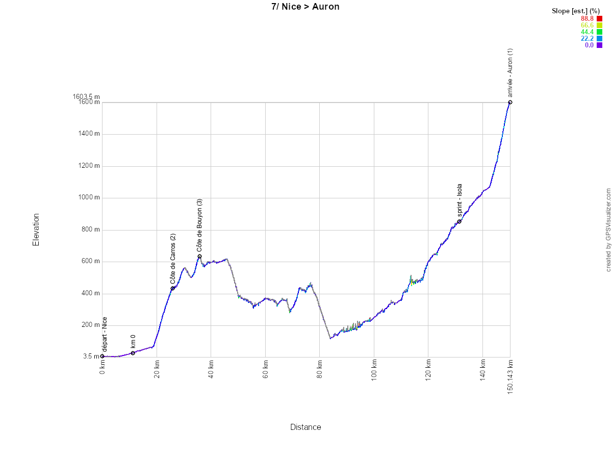 For the seventh stage of Paris-Nice 2026, the riders will head for the upper part of the Nice hinterland, starting from the Promenade des Anglais in Nice itself. After following the Var to Colomars, the riders will then reach the first difficulty of the day, the Côte de Carros (2nd category). Shortly afterwards, they will reach the Côte de Bouyon (3rd category) and continue westward to Roquestéron, before returning and crossing the Var again at the Pont Charles-Albert.They will then follow the Var and continue northward, climbing gradually. They then battle it out in the sprint at Isola and continue climbing until they reach Auron, the final climb of the 1st category.