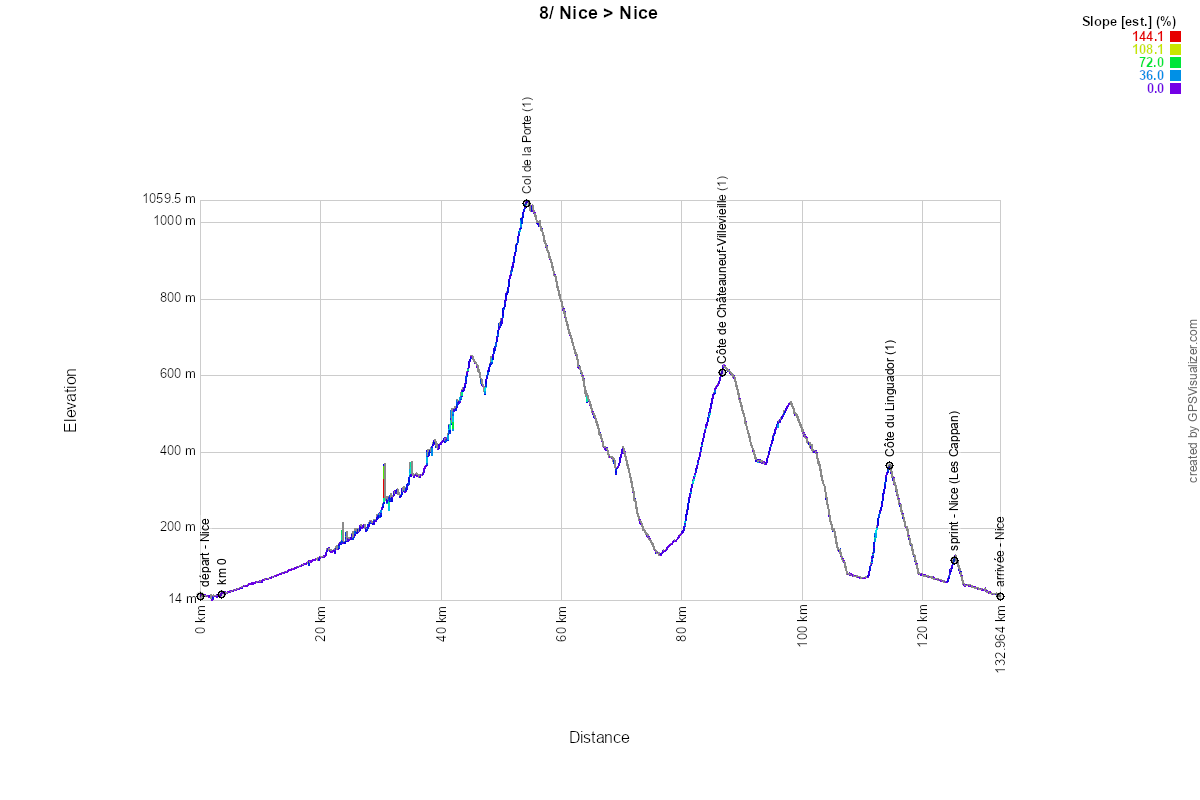 The final stage will start and finish in Nice. However, contrary to usual practice, there will be no Promenade des Anglais on the program, nor even Col d'Èze... no, this time the start and finish are planned on the Allianz Riviera side. At the start, the riders will head north on the left bank of the Var and, as on the previous day, they will cross it at the Charles-Albert Bridge, but this time at Plan-du-Var they will turn northeast towards Duranus and approach Lantosque. They then head south and will have to climb the Col de la Porte (1st category) before passing through Lucéram and L'Escarène and descending to La Pointe de Blausasc, then climbing again to approach Contes before heading back towards the Var. They pass through the Côte de Châteauneuf-Villevieille (1st category), Tourrette-Levens, and Aspremont, then arrive at a small circuit and follow the M6202 along the Var, turning around at a roundabout before heading for the Côte du Linguador (1st category) and returning once again to the M6202 where, this time, they continue to the finish in Nice, once again near the Allianz Riviera.Below you will find the timetable, profile, and OpenStreetMap map for this eighth stage of Paris-Nice 2026. Click on the images to enlarge them.