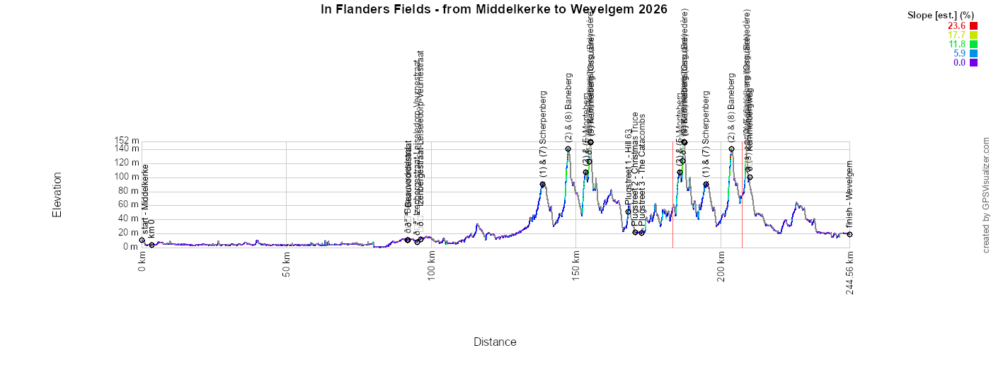Below you will find the schedule, the OpenStreetMap map, and the profile for In Flanders Fields - from Middelkerke to Wevelgem (Ghent-Wevelgem) 2026. Click on the different images to open them.