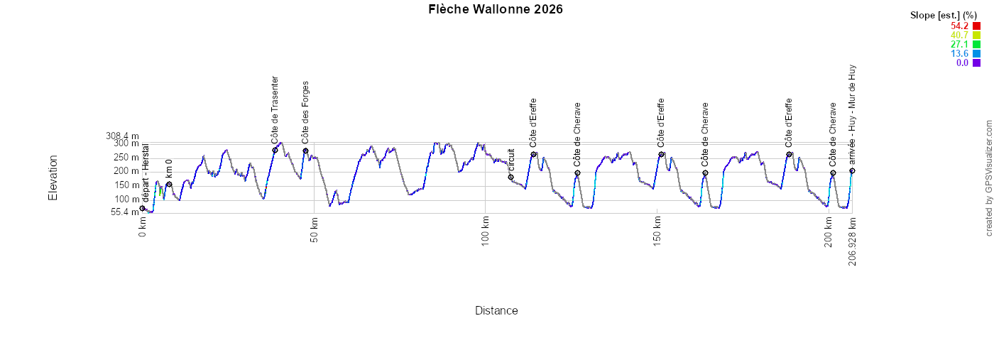 Below you will find the schedule, the route on an OpenStreetMap map, and the profile of the 2026 Flèche Wallonne. Click on the images to open them.