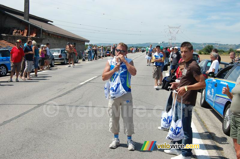 "Titi" et ses fils avec les musettes pour les coureurs de l'équipe AG2R La Mondiale