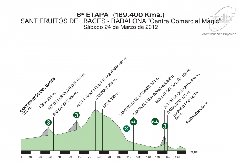 La sixième étape entre Sant Fruitós del Bages et Badalona (Centre Comercial Màgic) peut être la seule étape où les sprinteurs ont une chance de gagner. Malgré la montée de la Conreria à proximité de l'arrivée, le circuit final dans les rues de Badalona peut permettre aux équipes de sprinteurs de contrôler la course afin que la victoire puisse se jouer dans le sprint final.Sunday 25 March 2012 7/ Badalona "Centre Comercial Màgic" > Barcelona (Sarrià) 119 km 1/ Julien Simon (Saur-Sojasun) - 2h47'02"
