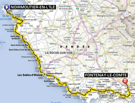 After having reached the mainland in Beauvoir-sur-Mer, this first stage will follow the coast line in the Vendée department and visit Saint-Jean-de-Monts, Les Sables-d'Olonne, Saint-Vincent-sur-Jard and La Tranche-sur-Mer before it goes landinwards close to L'Aiguillon-sur-Mer via the Marais Poitevin towards the first ever stage finish in Fontenay-le-Comte.