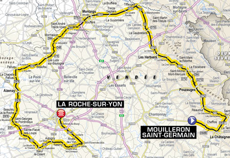 In between, the race first goes off south-east down to La Châtaigneraie before it turns north-west via Les Herbiers. In Tiffauges the riders will turn left and go via Montaigu towards Palluau where they'll turn again, this time southwards via Aizenay and Beaulieu-sur-Roche before they go on till the finish in La Roche-sur-Yon.