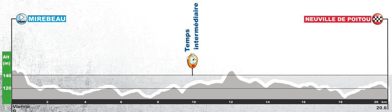Comme d'habitude cette même arrivée à Neuville-de-Poitou sera utilisée à nouveau l'après-midi, mais cette fois-ci pour que les coureurs coupent la ligne un par un, dans une épreuve chronométrée.La rampe de lancement de ce contre-la-montre individuel se trouvera à Mirebeau.