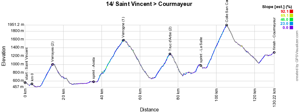 For the start of the 14th stage, a transfer will have been necessary, to get to Saint Vincent and the stage awaiting the riders this Saturday will be short but difficult. During this stage, the riders will have to climb no less than 4 difficulties (not taking into account the intermediate sprint which will be in La Salle on top of a short climb as well): Verrayes (2nd category), Verrogne (1st category), Truc d'Arbe (2nd category) and Colle San Carlo (1st category), before they end of the stage with a final climb towards the finish at Courmayeur where the finish line will be drawn at the cableway Skyway Monte Bianco which connects Courmayeur to the Mont Blanc and Chamonix. This final climb will be 8 kilometers long with an average slope of 6% for the first 3 kilometers and then 2 to 3% for the remaining distance.