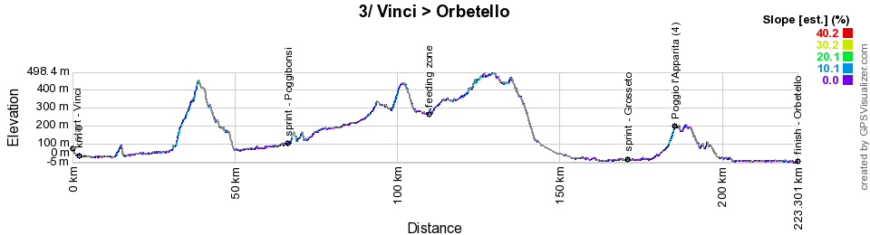 From Vinci, at the same level as Florence, the riders will start the 3rd stage, via Emboli, and like the previous stage again via a climb which is not referenced for the KOM classification, via Certaldo and the intermediate sprint in Poggibonsi, the sprint in Grosseto and the climb of the Poggio l'Apparita of the 4th category, followed by about 25 kilometers flat towards the finish line in Orbetello, mostly on the coastal road around the laguna of Ponente.