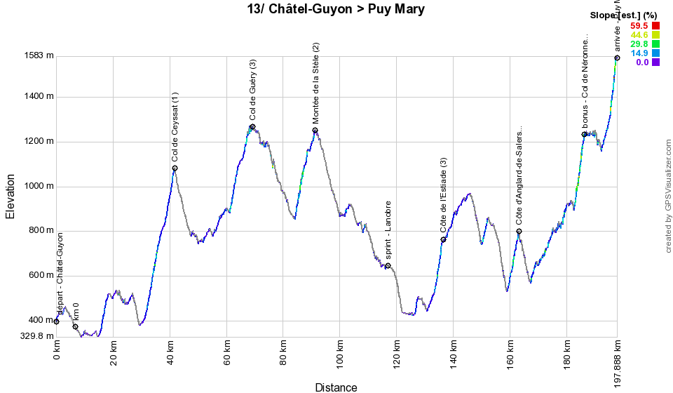 - difficulties and climbs : Col de Ceyssat (1st category) at km 36 - 10,2 km à 6,1%, Col de Guéry (3rd category) at km 63,5 - 7,8 km à 5%, Montée de la Stèle (2nd category) at km 85,5 - 6,8 km à 5,7%, Côte de l'Estiade (3rd category) at km 130,5 - 3,7 km à 6,9%, Côte d'Anglards-de-Salers (3rd category) at km 153,5 - 3,5 km à 6,9%, Col de Neronne (2nd category) at km 180,5 - 3,8 km à 9,1% and Puy Mary Pas de Peyrol (1st category) at km 191,5 - 5,4 km à 8,1%