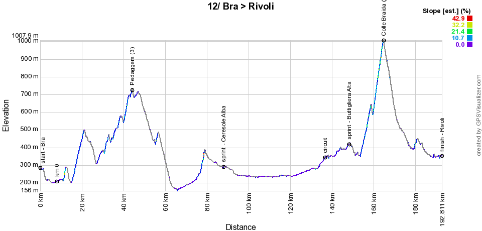 The 12th stage will be slightly more difficult, in particular because of a slightly more difficult climb in the final part of the stage. From the start in Bra, the riders will complete almost a loop to get to the first difficulty of the stage, the 3rd category Pedaggera climb at the northwest of the start town. Passing north of Bra, they will contest the intermediate sprint at Ceresole d'Alba before continuing on the northwestern - flat - route to the finish town of Rivoli. Crossing the finish line, however, they will still have a circuit of just over 53 kilometers to complete, west of the finish town. In this loop they will find the intermediate sprint of Buttigliera Alta quite early and it is shortly after this sprint that the road rises to climb the biggest difficulty of the day, the Colle Braida (2nd category), a 9.8 kilometer climb at 7% and with a maximum of 12%. The descent is more or less the same style and they have about 15 kilometers left on the flat before crossing the finish line for the second and last time.Below you will find the time schedule, the profile and the Open Street Maps of the route of the 12th stage of the Giro d'Italia 2023. Click on the images to enlarge them.