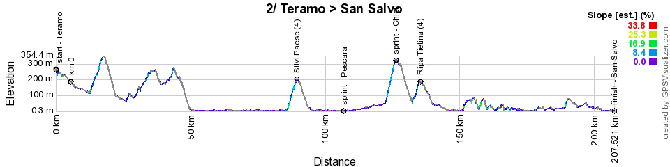 The second stage will start in Teramo, northwest of the time trial, and the riders will pass later on the road very close to the cycle track on which the time trial passed, in the opposite direction. Before reaching this point, they will first head towards the sea, which they will then follow towards the south and shortly before arriving in Pescara, where the first intermediate sprint will be held, they will go back inland a little to look for the climb of Silvi Paese (4th category) After the sprint of Pescara, they will go inland again, to climb to Chieti, but this climb will not count for the best climber classification but will be considered as an intermediate sprint.On the way back to the seaside there is first a small descent from Chieti, before climbing up to Ripa Tietina (4th category) after which they follow the road along the seaside until the finish in San Salvo.