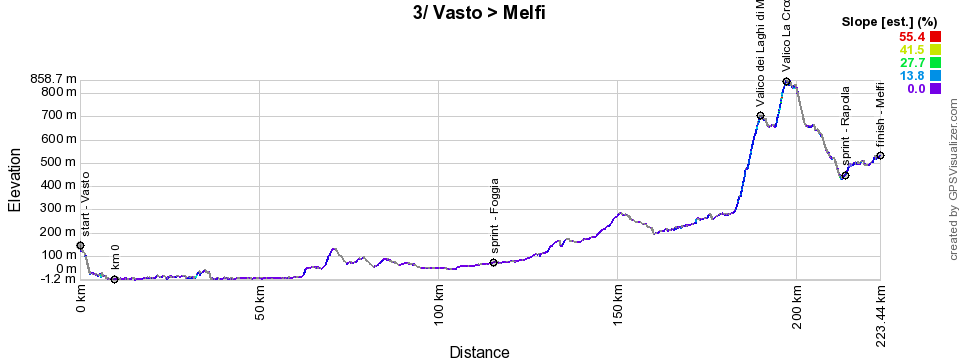 The start of the 3rd stage is in Vasto and the stage initially follows the end of the previous stage's route. It is first along the seaside, before heading to Foggia and the first intermediate sprint. From there, the road rises, first timidly and then more sharply, to a first summit, Valico dei Laghi di Monticchio (3rd category), before the lakes and then, just after the lakes, the climb to Valico La Croce (4th category).After the volcano, there will be only the intermediate sprint of Rapolla before the finish in Melfi.