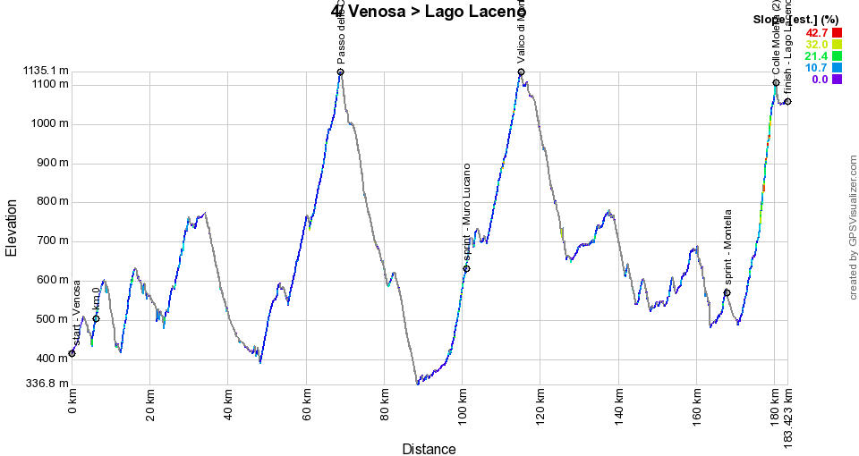 The start of the 4th stage is close by, in Venosa, and it is during this stage that the riders cross a part of the country from east to west, and therefore through the Apennines. In the middle of the course there are two important difficulties, of 2nd category, the Passo delle Crocelle and the Valico di Monte Carruozzo, with the intermediate sprint of Muro Lucano in between. Shortly before the final climb, the second intermediate sprint will be held in Montella. This last climb, the Colle Molella, allows the riders in about 15 kilometers to reach the plateau on which they will ride another 4 kilometers until the finish in Lago Laceno.Below you will find the time schedule, the profile and the Open Street Maps of the route of the 4th stage of the Giro d'Italia 2023. Click on the images to enlarge them.