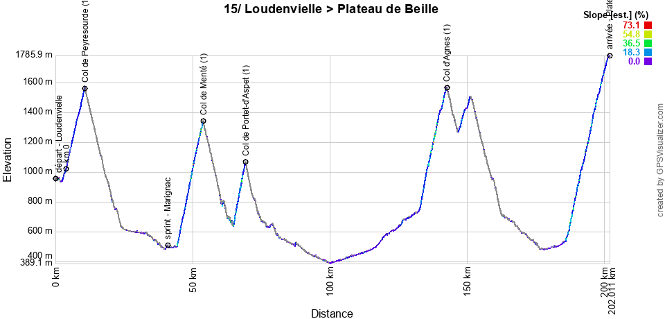 - Plateau de Beille (outside category) at km 197.7 - ^ 1780 m / 15.8 km at 7.9%.