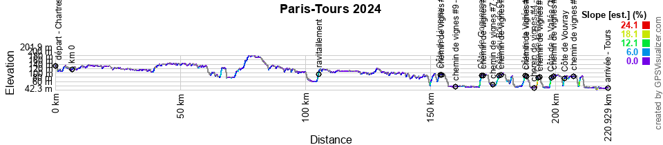 After the start in Chartres, from Place Châtelet, the race heads towards Vendôme and the feed zone, passing through Bonneval, Logron, Cloyes-sur-le-Loir and La Ville-aux-Clercs.After refuelling, the race continues south to Herbault before heading south-west to Dame-Marie-les-Bois and then south again to Cangey, where they are close to the final stretch of hills and vineyard paths, starting with the Côte de Limeray, the Chemin de Vigne de Limeray (#10, 900 m) and the Chemin de Vigne de Pocé-sur-Cisse (#9, 1.1 km). Moving away from the Loire River again, they arrive at Côte de Goguenne, immediately followed by chemin de vigne de Grosse Pierre (#8, 1.5 km) and a little further on chemin de vigne du Château de Valmer (#7, 500 m), Côte du Bois de Chançay and chemin de vigne de Chançay à Reugny (#6, 900 m). Heading back down towards the Loire and approaching the outward journey at Chemin de la Grosse Pierre, they then arrive at Côte de la Vallée du Vau and Chemin de Vigne de Noizay (#5, 600 m), followed fairly quickly by Chemin de Vigne d'Épinettes (#4, 1.2 km), Côte de la Rochère, chemin de vigne de Vernou (#3, 900 m) and, after crossing Vernou-sur-Brenne, Côte de la Vallée Chartrier, chemin de vigne de Peu Morier (#2, 1.6 km), Côte de Vouvray and chemin de vigne de Rochecorbon (#1, 800 m).