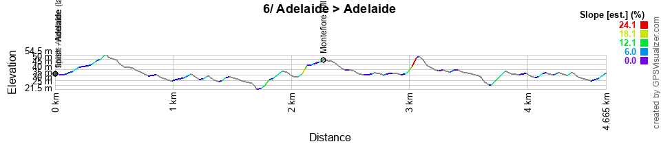 For stage 3, we're getting closer to Adelaide again, and the start is east of Adelaide, in Norwood. Heading east, right at the actual start, the riders begin the 10-kilometer climb up Stony Rise Road (2nd category).They then turn right to start a big loop south, passing through Summertown then Stirling, the Echunga intermediate sprint and Macclesfield before heading north again via Mount Barker, the Hahndorf feed zone, Balhannah and Lenswood and then turning west to complete this first loop with the ascent of Knotts Hill (1st category).