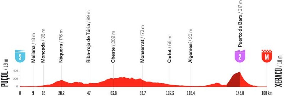 Une nouvelle chance attend alors les sprinteurs au départ de cette 8e étape à Puçol. Sur un parcours quasiment plat, qui évite soigneusement toutes les côtes à proximité, ils auront seulement à dompter la Puerto de Barx (^ 317 m) de 2e catégorie, pour pouvoir se disputer le sprint à Xeraco.La distance totale de cette étape n'est pas totalement sure. En effet, à un endroit l'organisateur l'annonce à 176,4 km alors qu'à un autre endroit elle est annoncée à 168 km.