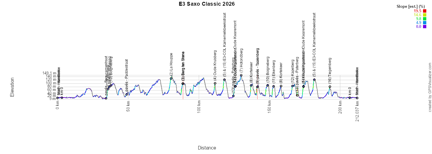 Het parcours van de E3 Saxo Classic 2026 is gewijzigd ten opzichte van 2025. Na de start in Harelbeke gaat de race naar het oosten, over het bovenste (en blauwe) deel van het parcours dat je op de kaart hieronder ziet, dat onder Waregem doorloopt en met name richting Oudenaarde gaat voordat het de eerste kasseien en beklimmingen bereikt (Beaucarnestraat met kasseien [1,2 km], de Katteberg [750 m à 6% / max. 11%] en de kasseien van de Holleweg [1,5 km]). Met de kasseien van de Paddestraat en een doortocht door Zottegem volgt dan de lus naar het oosten, niet ver van Geraardsbergen, voordat de renners het land van de heuvels en de kasseien bereiken!Het wordt een aaneenschakeling met La Houppe (1.880 m met 4,8% / max. 10%), Berg ten Stene (1.300 m à 5,2% / max. 9%) – en daar gaat het parcours over naar het rode gedeelte op de kaart – om iets verderop, na een passage door Ronse, de klim van de Oude Kruisberg (800 m à 4,8% / max. 9%) te vinden, een terugkeer naar Ronse en opnieuw een stuk naar het westen voordat het weer omhoog gaat naar de Karnemelkbeekstraat, die is omgedoopt tot de "E3 COL" en als 5e maar ook als 15e klim op het parcours staat (1.530 m bij 4,9% / max. 18%) daarna een doortocht door Berchem alvorens opnieuw richting de beklimmingen van het parcours te gaan. Daar vinden ze de Keuzelingsstraat - Oude Kwaremont, de Hotondberg (1.200 m met 4% / max. 8%) en iets verderop, na de doortocht door Zulzeke en ter hoogte van Nukerke, de Kortekeer (1.000 m met 6,4% / max. 17%), de Taaienberg (700 m à 6,3% / max. 16%) volledig met kasseien en – bij het bereiken van het oranje deel van het parcours – na de doortocht door Maarke-Kerkem en Schorisse, de Boigneberg (1.000 m à 5,2% / max. 12,3%) en de Eikenberg (1.250 m à 6,2% / max. 10%). Veel verderop vinden ze dan de Kapelberg (750 m à 7,1% / max. 14%), de Paterberg (400 m à 12,9% / max. 20,3%) volledig op kasseien, de Oude Kwaremont (2.200 m à 4% / max. 11,6%) volledig op kasseien en, bij een terugkeer naar het rode deel van de race, de beklimming van de E3-COL Karnemelbeekstraat (1.530 m à 4,9% / max 18%), een nieuwe doorkomst door Berchem en iets verderop de Tiegemberg (750 m à 5,6% / max 9%), voor de terugkeer naar Harelbeke, waar de finish op dezelfde plaats als de start zal plaatsvinden, in de Stasegemsesteenweg.