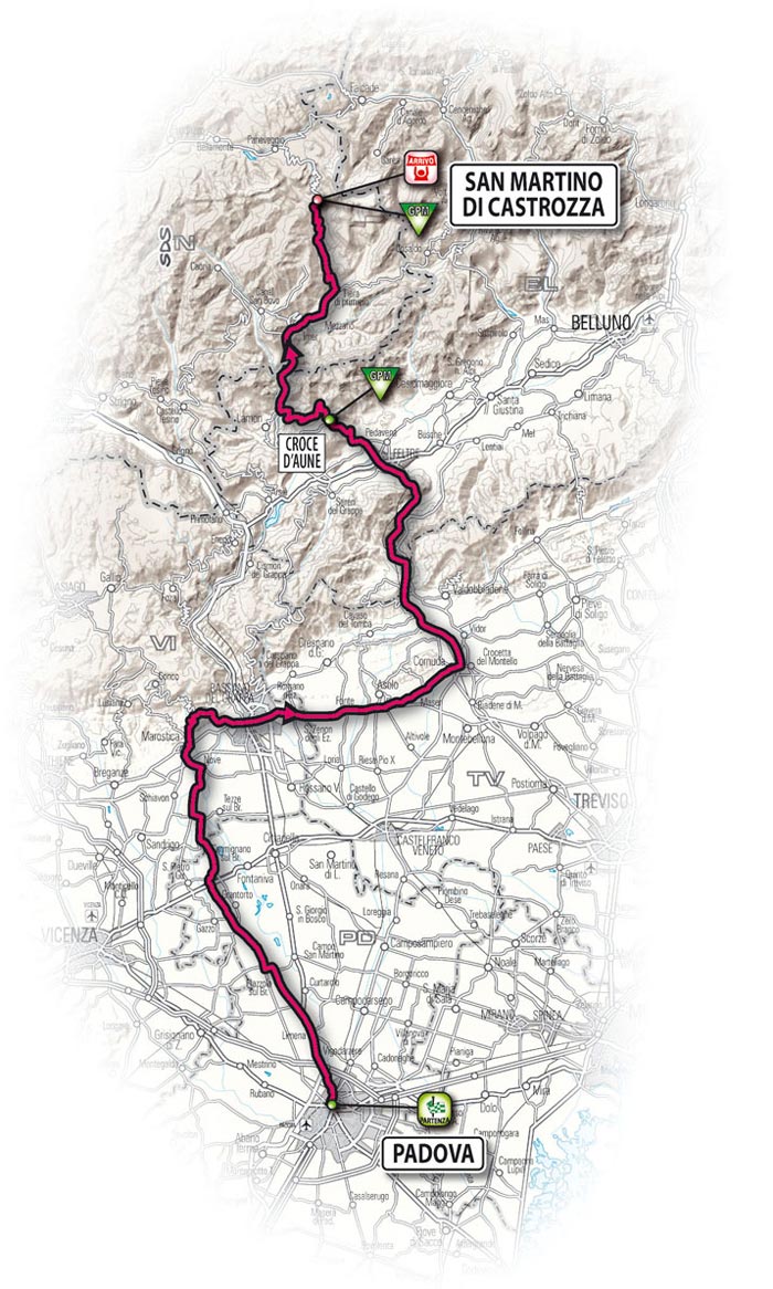 Après un petit transfert, la première étape de montagne se déroulera entre Padova et San Martino di Castrozza. Depuis Padova, les coureurs remonteront vers le nord pour aller dans les Alpes italiennes et arriver en hauteur dans la station de ski de San Martino di Castrozza dans les Dolomites. Lors de cette étape les coureurs monteront également le Passo Croce d'Aune depuis Pedavena.