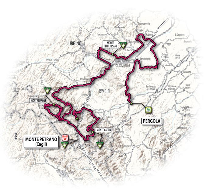 Pour une étape de plaine, cette étape propose aussi pas mal de cols avec notamment le Monte delle Cesane, le Monte Nerone, le Monte Catria et finalement l'arrivée en hauteur au sommet du Monte Petrano près de Cagli. Cette étape aussi s'effectue quasiment en boucle car les villes de Pergola et de Cagli se séparent seulement de 20 kilomètres !