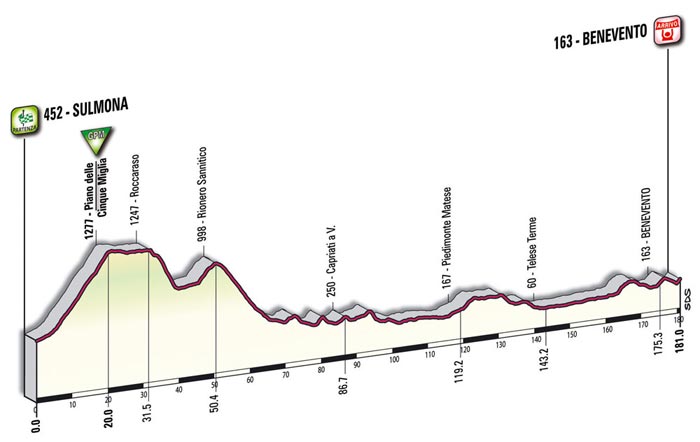 L'étape du jeudi 28 mai descend plein sud depuis Sulmona pour arriver 181 kilomètres plus loin à Benevento. Cette étape accidentée commence directement par la montée du Piano delle Cinque Miglia dont le sommet sera atteint au bout de 20 kilomètres, mais ensuite l'étape suit un parcours relativement plat.
