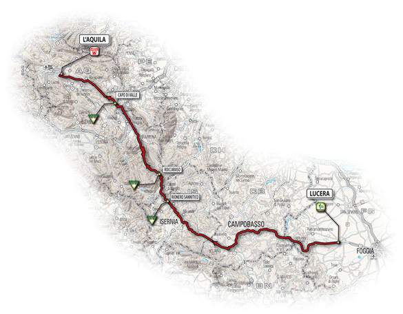 Deze etappe die Italië van west naar oost doorkruist is wederom een vlakke etappe die, na de start vanuit Avellino, echter wel een klimmetje met 380 meter hoogteverschil aan het begin van de etappe bevat, gevolgd door de afdaling tot aan de voet van de beklimming van de Valico dell'Imbandina (hoogte : 668 m). Er volgt dan een vlak stuk, een korte klim en ten slotte een 50 kilometer lange afdaling richting de finish in Bitonto.11/ woensdag 19 mei 2010 - Lucera > L'Aquila - 256 km