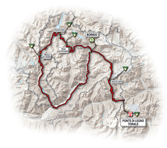 Voor deze laatste bergetappe heeft de organisatie van de Giro besloten de renners die zover gekomen zijn niet te sparen. In een circuit rondom de start in Bormio en een kort bezoekje aan Zwitserland hebben ze namelijk één grote en twee kleinere klimmetjes weten te verwerken: allereerst de klim van de Forcola di Livigno over 18 kilometer en een hoogteverschil van 1278 meter (hoogte : 2315 m, gemiddelde helling: 7,1%, maximaal stijgingspercentage: 13%) voor de opeenvolging van de kortere Passo di Eira (2211 m) en Passo di Foscagno (2291 m). Na de afdaling naar de start in Bormio volgt de beklimming naar het "dak" van deze Ronde van Italië (Cima Coppi), de Passo di Gavia over 24,9 kilometer en een hoogte van 2618 meter. Het hoogteverschil van deze klim is 1399 meter en de gemiddelde stijging is dus 5,6% met een maximaal stijgingspercentage van 14%. Na de afdaling zijn de renners nog niet uit hun lijden verlost want dan volgt nog de slotklim van 11 kilometer naar de finish bergop bovenop de Passo del Tonale (hoogte : 1883 m, hoogteverschil 631 m, gemiddeld stijgingspercentage 5,7% met een stukje van 10%).21/ zondag 30 mei 2010 - individuele tijdrit - Verona > Verona - 15,3 km