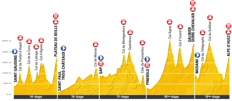Je remarque que les étapes Aigurande - Super-Besse et Saint-Paul-Trois-Chateaux - Gap sont très similaires : une montée constante tout au long de l'étape, une ou deux montées plus importantes en milieu d'étape et un gros truc à la fin.