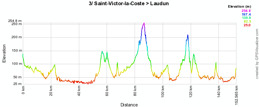 As you can see below, the 3rd stage's race route is quite complicated.The start will be on the Place de la Mairie in Saint-Victor-la-Coste where the riders will get back after a first 54 kilometer long loop via Bagnoles-sur-Cèze, Vénéjan and Caderousse.