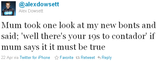 On avait déjà découvert qu'Alex Dowsett (Team Sky) tient beaucoup à l'avis de sa mère.Après avoir tweeté une photo de ses nouvelles chaussures ...