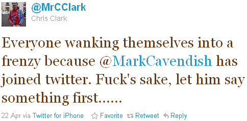 Un certain Chris Clark s'énerve quand il voit toute cette excitation suite à l'arrivée de Cav sur Twitter. Il s'étonne notamment que le coureur n'a encore rien dit alors que tout le monde s'excite déjà.