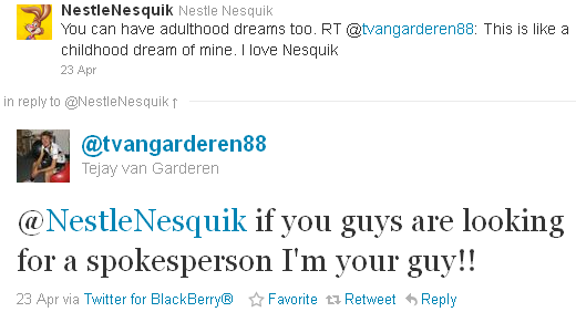 Le community manager de Nesquik travaillait visiblement également ce week-end car il relève un des tweets de Tejay. Quand il le retweete, Tejay pense déjà à sa carrière après le vélo ...